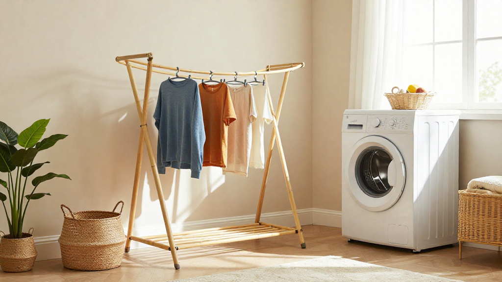 A folding drying rack is a practical solution for smaller spaces, perfect for air-drying delicates. -
